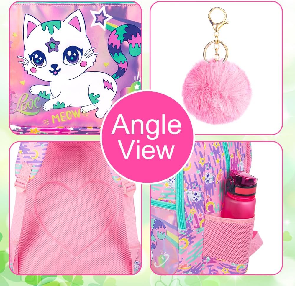 Rich Girls Backpack: Surprise 4-piece set, includes cat backpack for girls(16.5″x 12″x 6.5″Inches) + lunch box + pencil bag + furry pom. Reasonable configuration to meet your school travel needs.