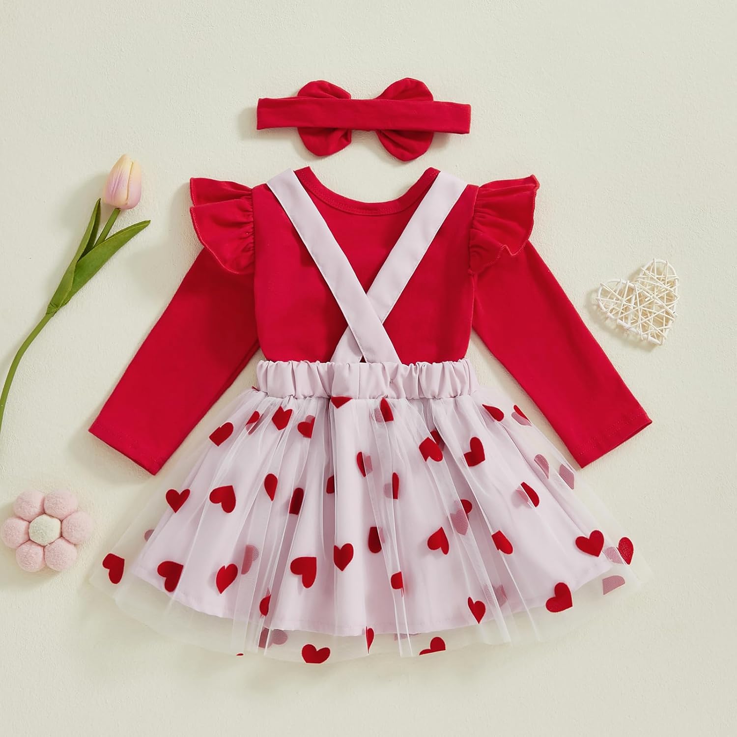 Be the first to review “Baby Girl Valentines Outfit Long Sleeve Romper Love Heart Tulle Suspender Skirt Baby Valentines Dress+Headband”