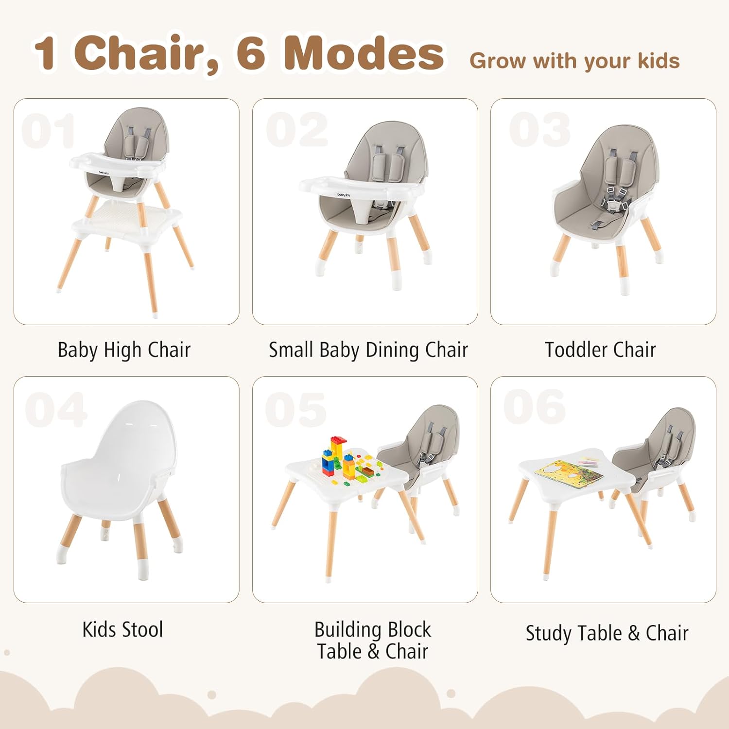 6-In-1 Convertible High Chair: We all know that children grow so fast, so our chairs are designed to be easily converted into a high chair, toddler booster seat with guardrails, kids table and chair set, building block table and chair set, infant floor seat, or an ordinary stool. The 6-in-1 design meets the diverse needs of babies at every stage of their growth.