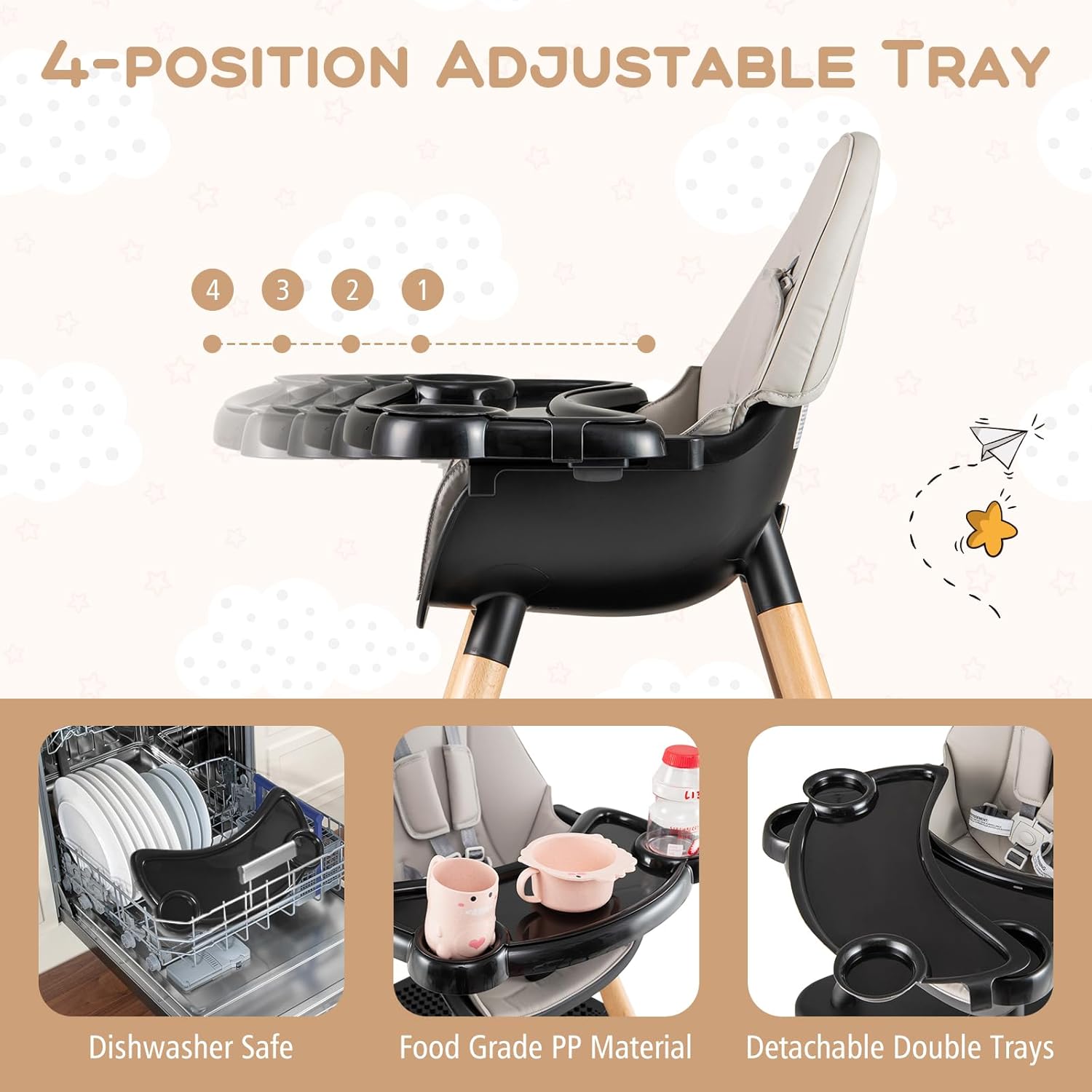 【4-Stage Adjustable & Detachable Tray】: Equipped with a 4-position adjustable food tray, this wooden high chair provides more space for fast-growing children. And this feeding tray is detachable so that after the baby has finished eating, parents can easily in the sink to thoroughly rinse the plate, convenient for the next use.