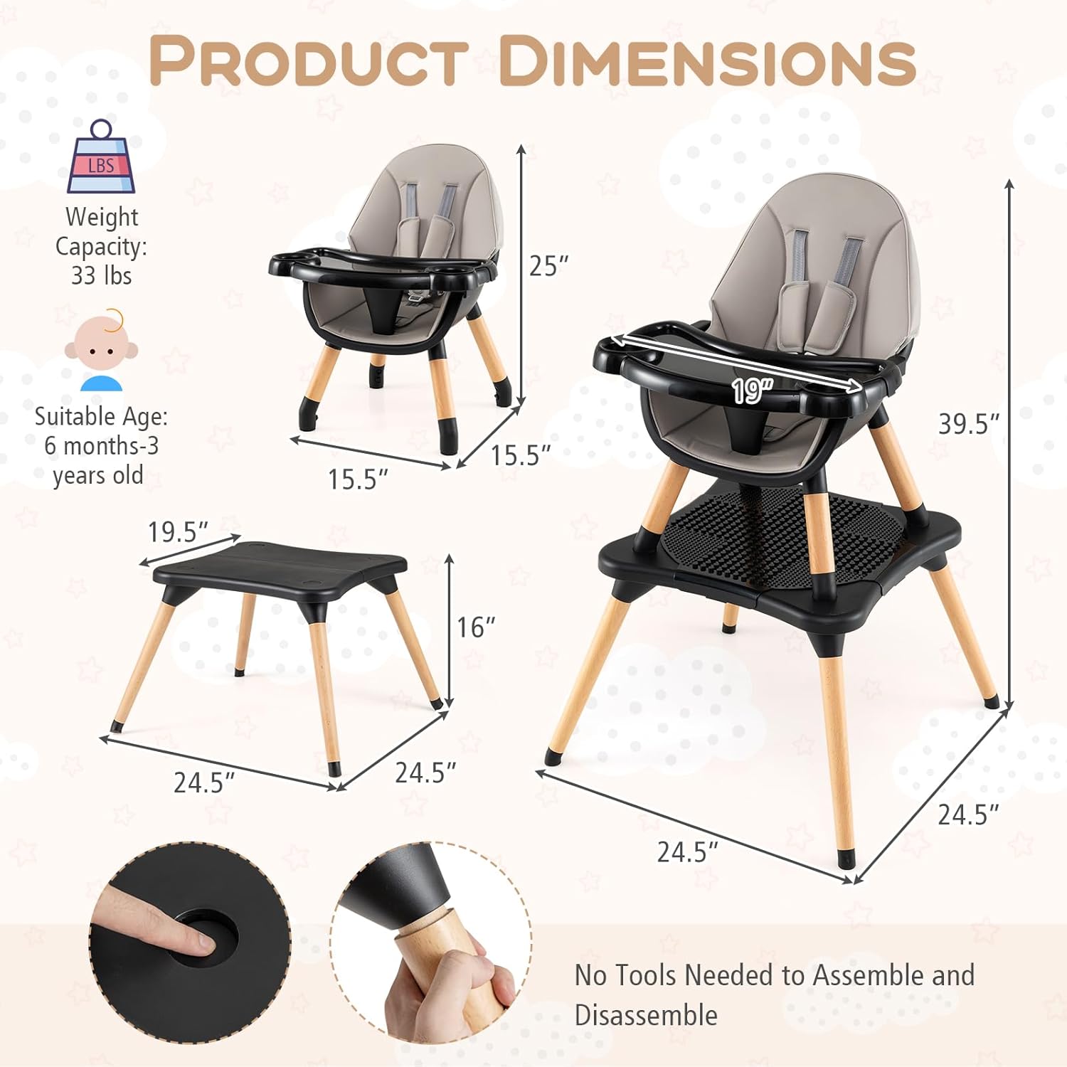 【Easy Clearance and Assembly】: With detailed instructions, parents can easily complete the assembly or covert this using from high chair to table chair set without any tools. And removable PU cushion cover is suitable for kids to eat on this high chair because of the whole simple and easy cleaning process. Product Dimensions: 24.5″ x 24.5″ x 39.5″ (L x W x H)
