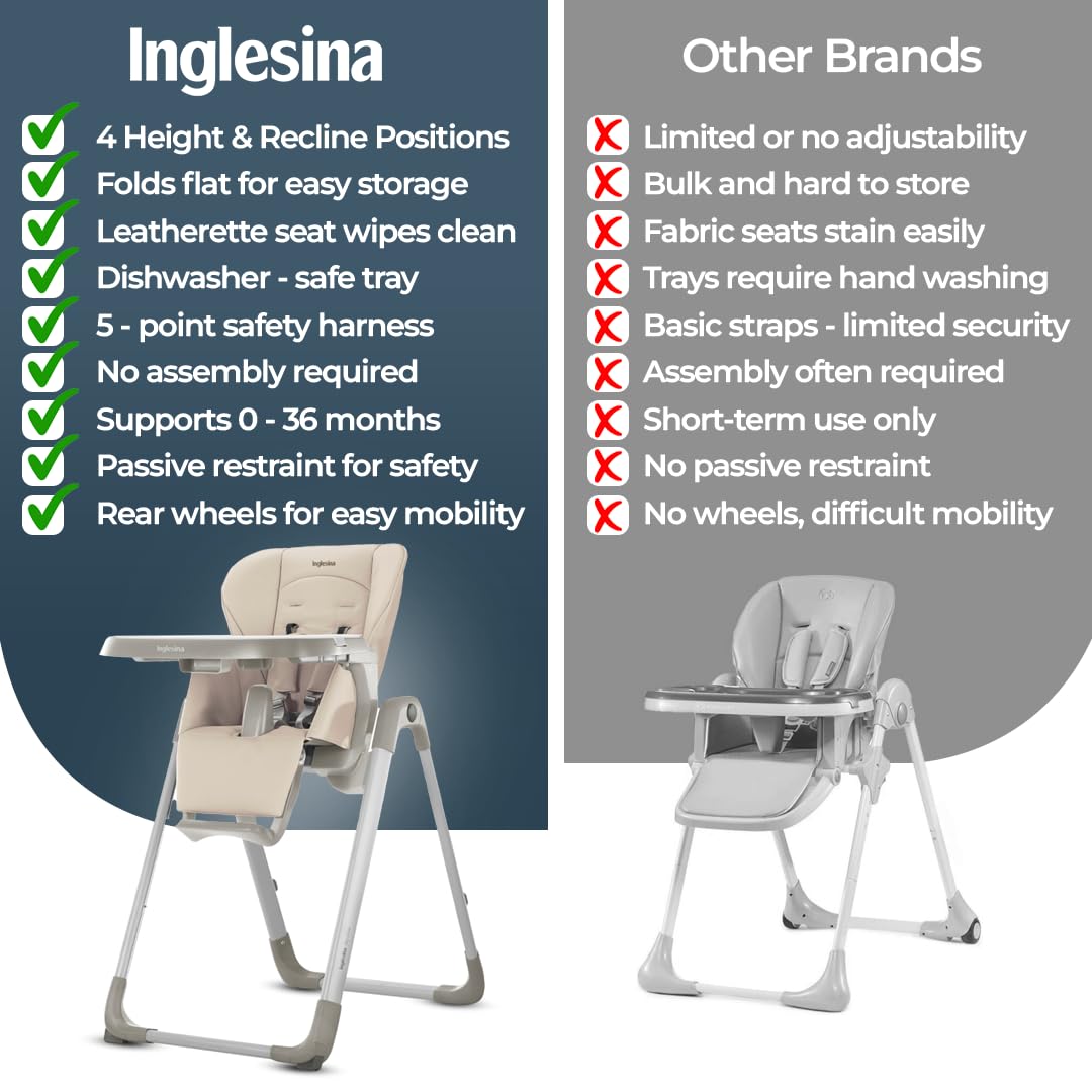 “Inglesina, Italy’s leading premium baby gear brand since 1963, known for high-quality strollers and highchairs, has crafted the My time High Chair to support your child from birth to 36 months. Designed with both comfort and versatility in mind, My time features a 3-position ergonomic backrest and adjustable footrest, providing ideal support as your baby grows. Its 4-position height adjustment accommodates any table height, allowing you to sit comfortably without straining during meals. Meal times can be messy, but My time’s leatherette seat makes cleanup simple—wipe it with a sponge or pop the dishwasher-safe tray cover in to clean. This compact, foldable high chair stands upright when collapsed, keeping your dining area organized and tidy. For added convenience, My time has a removable padded lining for hand washing, rear wheels for easy mobility, and multiple adjustable settings for both tray and back straps. With an elegant, gender-neutral design, My tme is the perfect combination of functionality and style for modern families.”