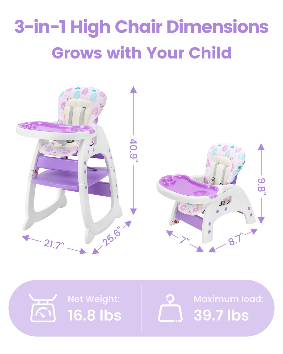 Premium Safety & Versatility: Our highchairs for babies and toddlers are designed to grow with your child from 6 months to 6 years. This durable, adaptable baby feeding chair features a hygienic plastic tray for easy cleanup and a secure 5-point harness to ensure maximum safety. The convertible high chairs accommodate children up to 40 pounds, offering comfort and security throughout their early years.